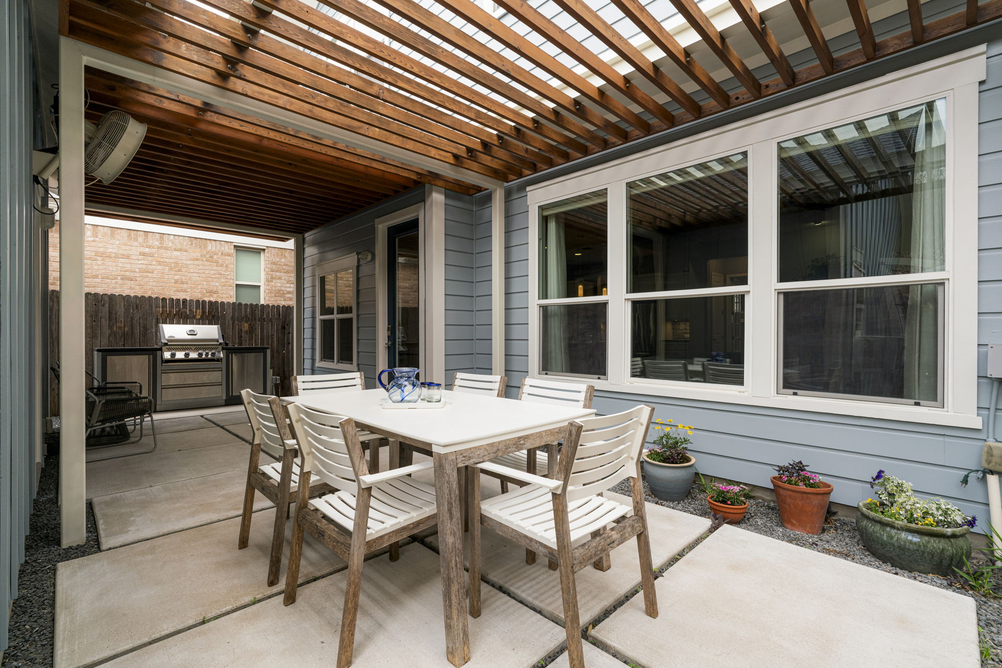 The rear of the property reflects the same intentionality found throughout the interior. Professionally maintained landscaping sets the stage for a rear patio with misting fans - keeping outdoor time comfortable even during Austin summers - and a pergola with a custom built-in grill that elevates al fresco dining and entertaining.
